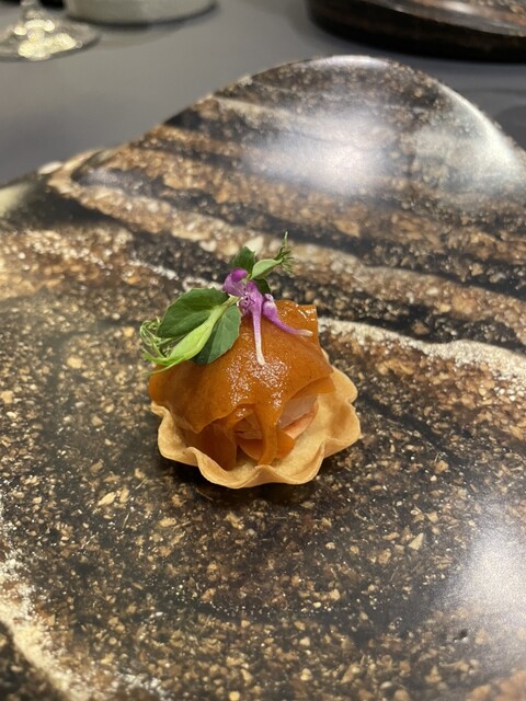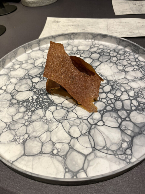 今回特に進化を実感したのは、伊勢海老のタルトと鰤大根。伊勢海老のタルトは、煮詰めた伊勢海老の殻を乾燥・粉砕したものとチョコレートを混ぜてソースの一部にしているが、この配合の微調整が決め手か全く殻独特の癖が無く伊勢海老のコクと旨みのみ。鰤大根は何度も頂いているが、皮目の焼き方なのか大根の煮汁の味の微調整なのか、味の輪郭が更にはっきりして旨みが増している。
