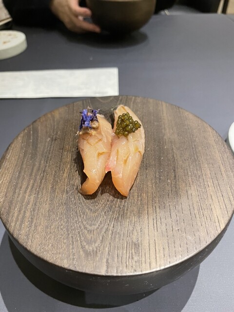 ・杉寿司(縞鯵) 肝ソースと国産キャビア乗せ