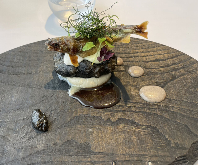 白焼きと肝を使ったなめろうにブルーチーズ・甘めのソース・白ワインで風味づけした山葵を添えて。オープン前にあつた蓬莱軒で8ヶ月修行したと言うシェフの鰻の焼き具合は鰻屋顔負け。