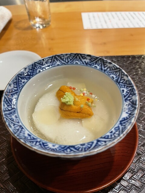 以前から気になっていたのですが、やっと予約して初訪問。内装や雰囲気は超高級ではないが、使う素材は採算度外視。京都府向日市塚地の筍、北海道根室産のSPクラスの馬糞雲丹、滋賀県姉川の稚鮎等々、思わず「こんな値段で大丈夫ですか?」と言ってしまったくらい。