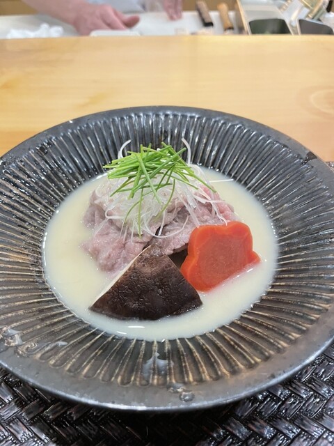 刺身(虎河豚、鯨、鱈白子落とし柚子胡椒)