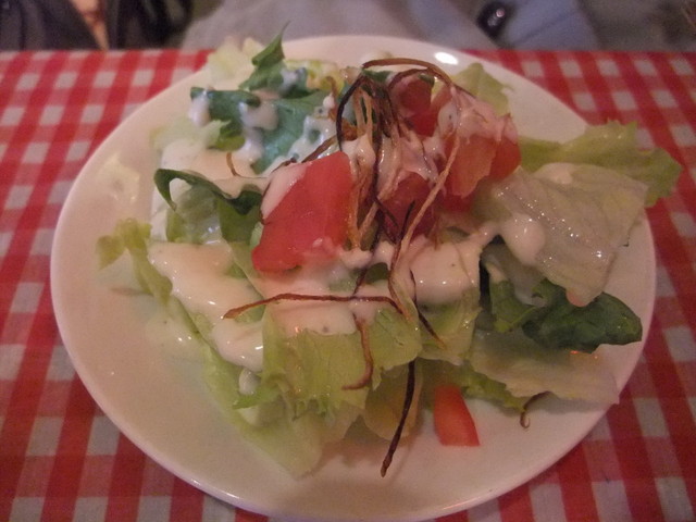 サラダはシーザードレッシングにフライドオニオン、ダイストマト等、ドレッシングがナイス