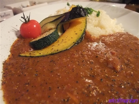 ほんのり色付いたライスはキャロットライスかな、そこにグリル野菜とビールで煮込んだカレー