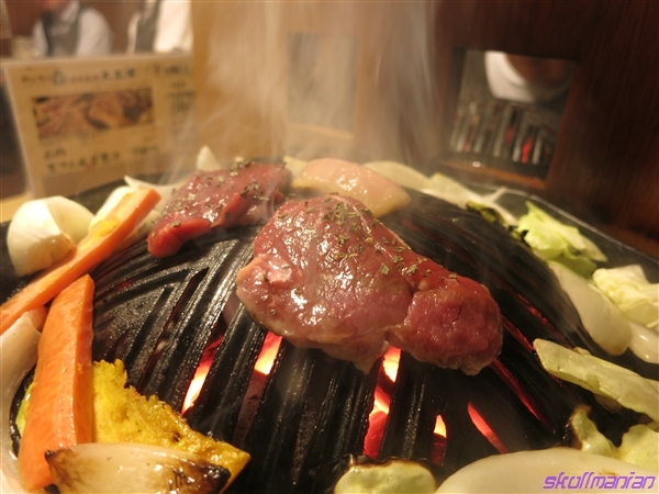 程好く焼けてきましたら、肉を中央に乗せて焼き始めまして
