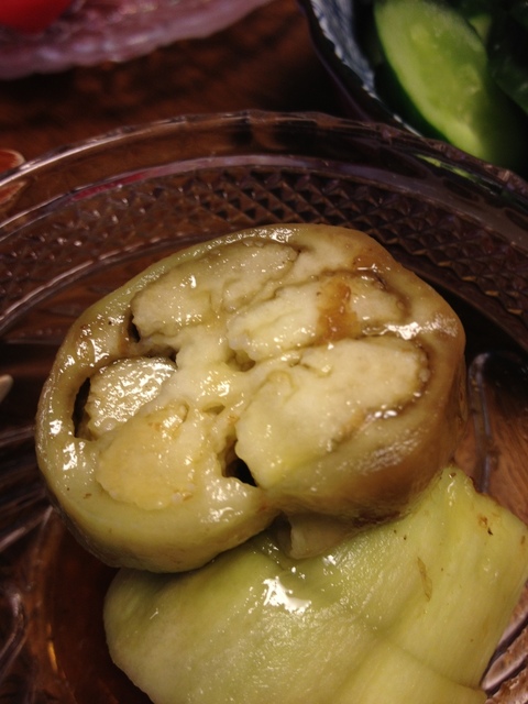 お茄子は焼き茄子にして皮を捲って・・・切り付けます。これもすごい水分が出てきますが・・・型崩れしない。カチッと締った身です。中の身の模様もくっきり・・・甘い中に独特のほろ苦さがあって何時もながら旨い茄子・・・塩や自家製ポン酢でも美味しく頂きました。