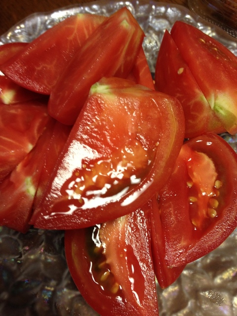 実際、包丁で切りつけると皮が硬い事もあり水分が飛び出す様な・・・そんな保水力のあるトマトでしたね。輪切りにすると水分が流れるのでくし切りに・・・甘くて肉厚な旨いトマトでした。