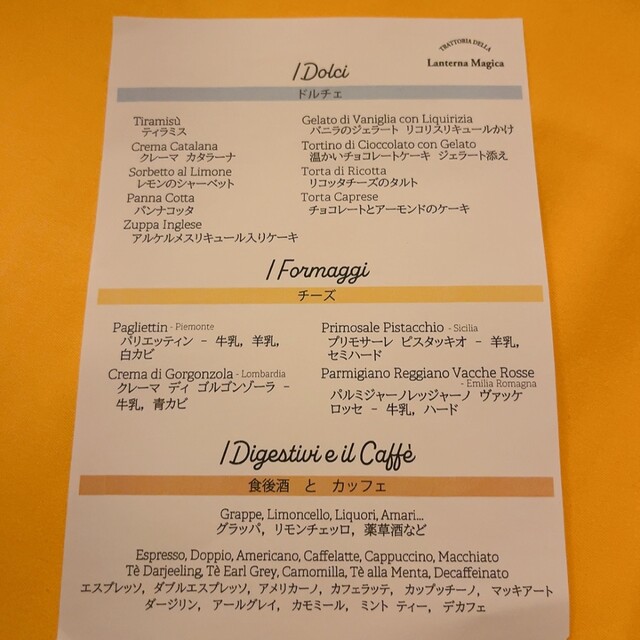 ワインも飲み終わったので、〆はワゴンで運ばれるグラッパ。今回も甘めのモノをいただいたが、相変わらず品数が多くて迷うなぁ。
