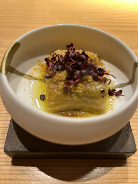 カラスミのパスタはスープパスタ風。鯛出汁を加えるということで期待したんですが、これはあまり好みではありませんでした。スープパスタという本来のイタリア料理にはない概念。こちらについてはさらなる工夫に期待したいです。