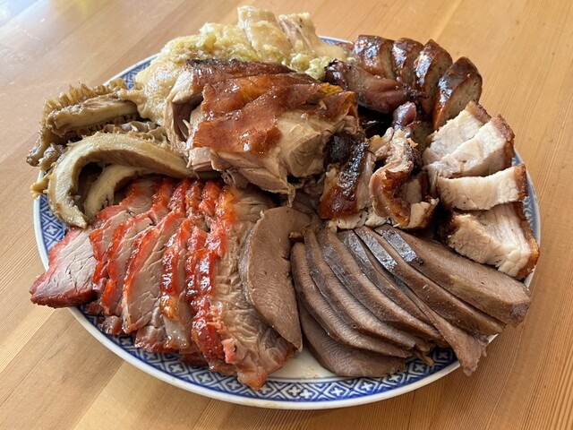 食べ切れなくても持ち帰れると聞いていたので、全部盛りを注文。叉焼、皮付き豚、牛ハチノス、あひるが特に印象に残りました。