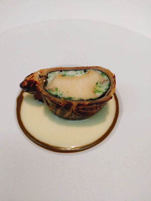 そのあとの鮑のパイ包み!シグネチャなのかなぁ、鮑ってバターと合うよね…比較的全体を通して軽めの現代的なフレンチだったけど、一番これがオーソドックスなフレンチの重さがあったかも。それでもどっしり感と軽やかさのバランスが絶妙で、肝のソースもすごくおいしかった!