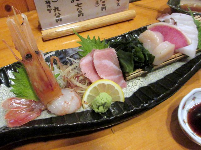 刺身盛合せはしめサバ、マグロ、ホタテ、白身、タコの5種で、1500円からだが、もちろんお好みに合わせてグレードアップして注文しても良い。