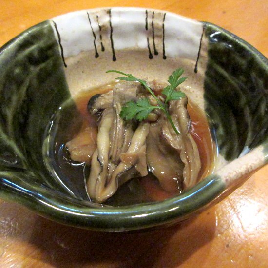 まずは生ビールを一杯、牡蠣を使ったお通しを頂きながら喉を潤す。