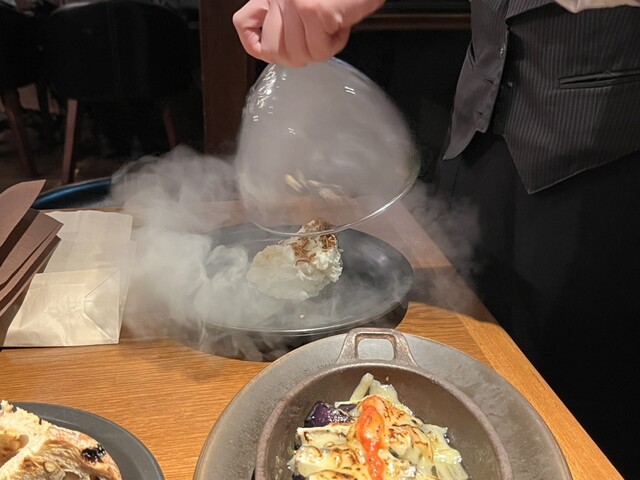 料理はほぼ毎回頼むスモークポテトサラダinゼッフル粒子、帝国艦隊へのトールハンマー焼き(今回はナスと魚)、本日のヒューベリオンなども注文。