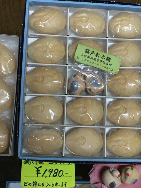 両手にかしわめし、小倉駅前のシロヤのパン、厚狭駅前の幸月堂の餅とパンを持ち、駅前のトイレで用を済ませた後、駅前の客待ちタクシーに乗り、鶴声軒本舗へ。