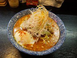 いつもつけ麺ばかり頼んでいたので久しぶりに、ごまの辛いそば830円+大盛り120円+大将手作り味付け燻製玉子100円(ずっとお試しセールで150円が100円になっています)を注文してみました。つけ麺は麺の量が250グラム(大盛りは400グラム)。ラーメンは麺の量が140グラム(大盛りは250グラム)だそうです(お店の人に聞きました)。と言うわけでラーメンにするときは大盛りにした方がいいです。つけ麺の時は大盛りにしてしまうと夕食まで影響するくらいお腹がいっぱいになってしまいます。