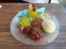 くっちゃんはキッズプレート(自家製ハンバーグとチキンライス、パン、ポテト、デザートのコンビプレート、キッズドリンク)650円を注文しました。キッズドリンクはオレンジジュース、アップルジュース、ミルク、アイスオルゾミルクティから選べました。