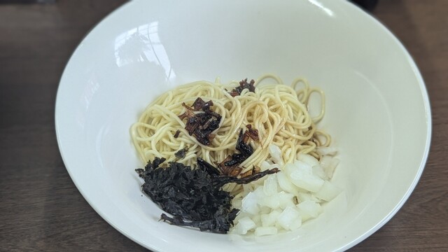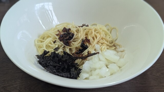 今回は、「焦がし醤油ラーメン」+「和え玉ネギ(ハーフ)」を注文しました。