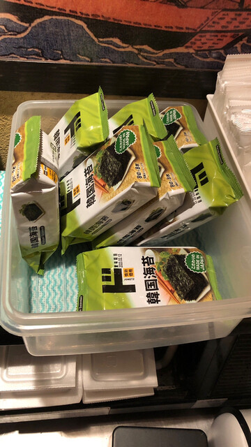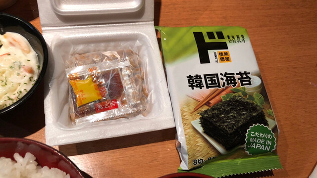 入店したらまず支払いをして着席、料理を取りにいきます。ミミガーと麻婆豆腐は苦手なのでそれ以外のおかずをちょこちょこっと取りライスに納豆、韓国海苔で食べ始めました。