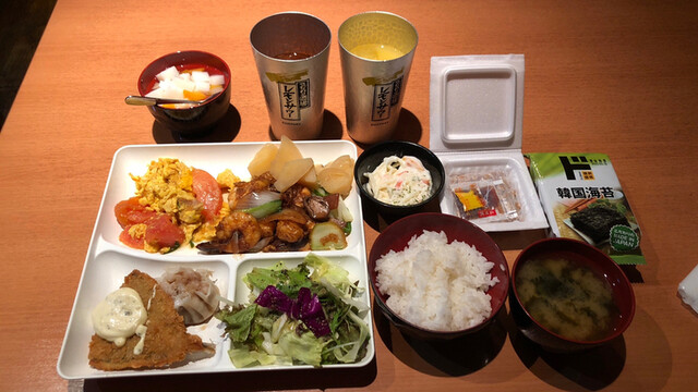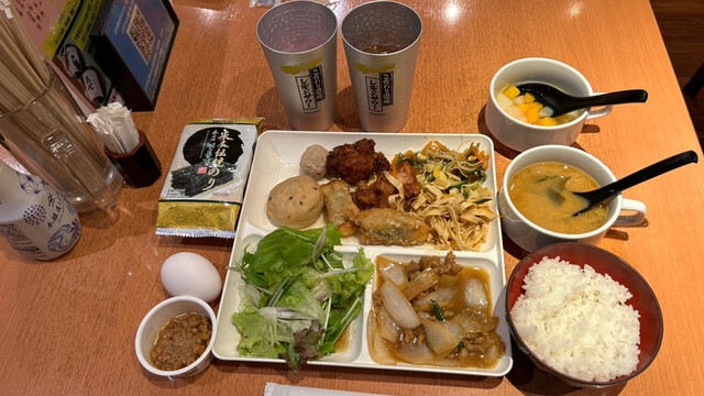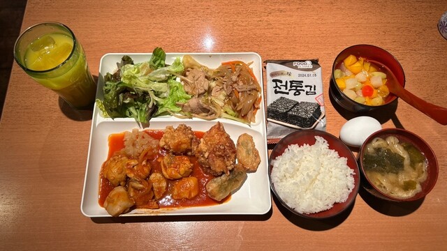 とりあえず入ってみたら先払いとのことで支払いをして着席、料理を取りにいくと結構ビックリしました。値段からして大した事ないだろうと思ったら、普通のおかず以外に納豆、生卵、韓国海苔、カレー、杏仁豆腐までありドリンクもフリーです。