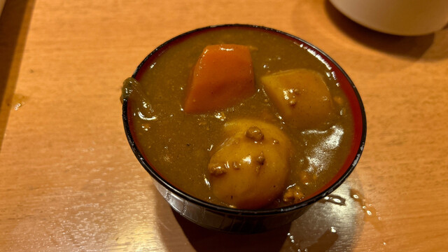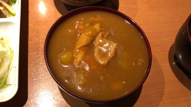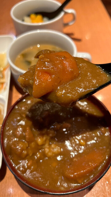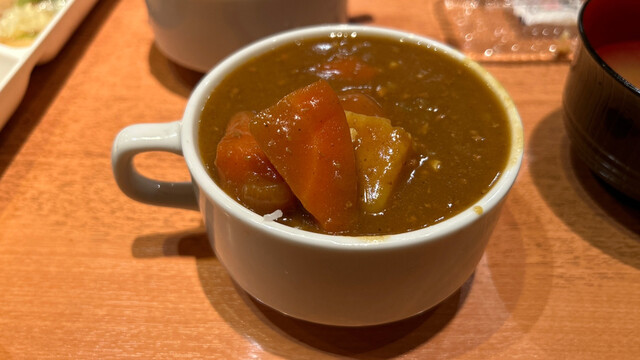 大体食べ終わり、2回目はカレーを取ってきました。具沢山ということでニンジンなんかは大きく豚肉もたっぷり入っていて、辛くないお母さんのカレーの味で私的にタイプです。