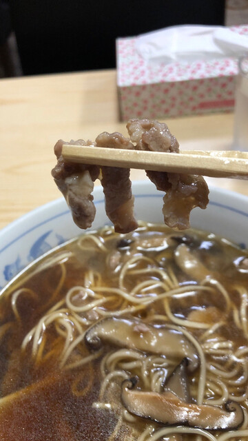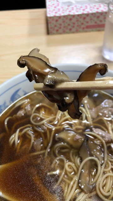 17時過ぎ到着で夜の部1番乗り、口頭でウリのしいたけそばを注文して10分程で着丼しました。かけラーメンに大量の椎茸と若干の豚肉が入ったあんかけが乗ったものです。