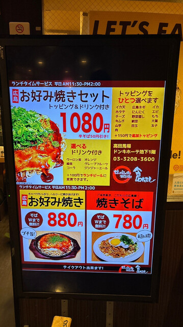 東京都高田馬場駅早稲田口から徒歩2分の広島お好み焼き・鉄板焼き 倉はし 高田馬場店にてお好み焼き880円。高田馬場駅前のビルの地下一階にある広島焼きのお店のランチです。