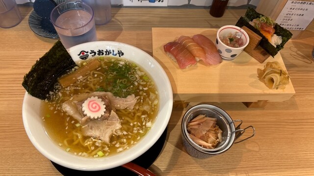 東京都新橋駅銀座口から徒歩1分の鮨とラーメン うおがしやにて追い鰹ラーメンと赤酢にぎり5貫セット500円。5日前にオープンしたラーメン店で明日までは1600円のセットが500円で提供されるとのことで、それなら電車賃と時間を使う価値があるなとやってきました。場所は立ち食いそば屋だったそば田の跡地になります。