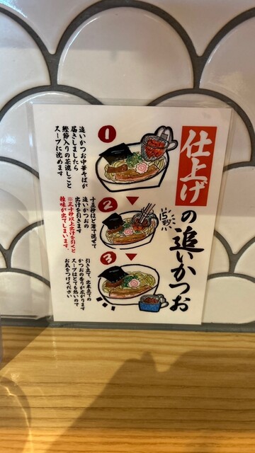 結局45分くらい並び店頭の券売機をポチッとして入店着席、程なくして追いかつおと鮨が提供され、時間を置かずラーメンも到着しました。