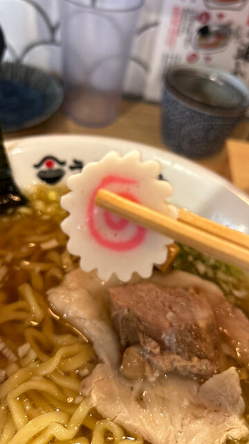 ラーメンの具はチャーシュー、鰹塊、メンマ、なると、海苔にネギとなります。食べ方にあるように追いかつおをスープに浸して15秒程箸で混ぜました。