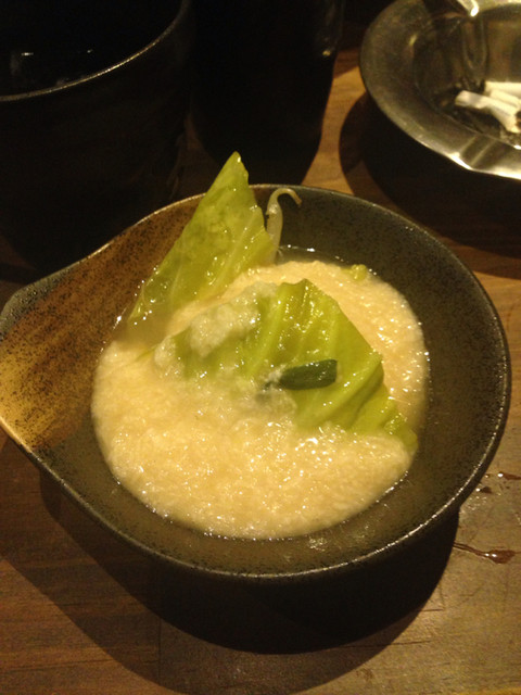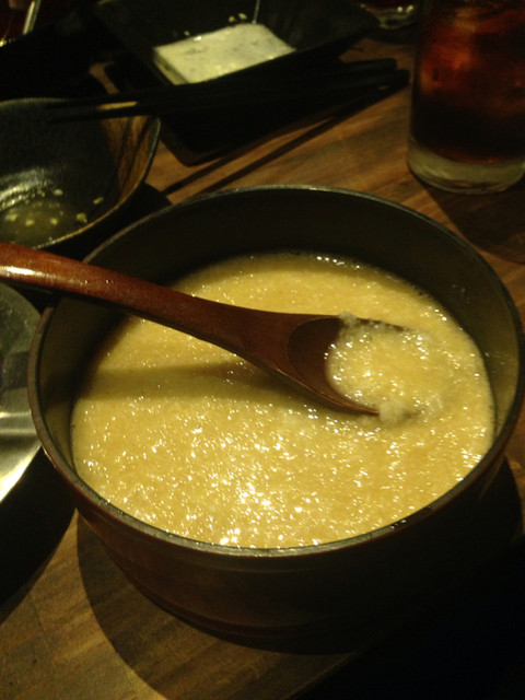 もつ鍋取り分けた後とろろをどうぞ