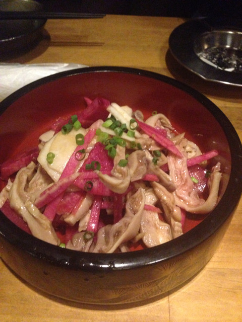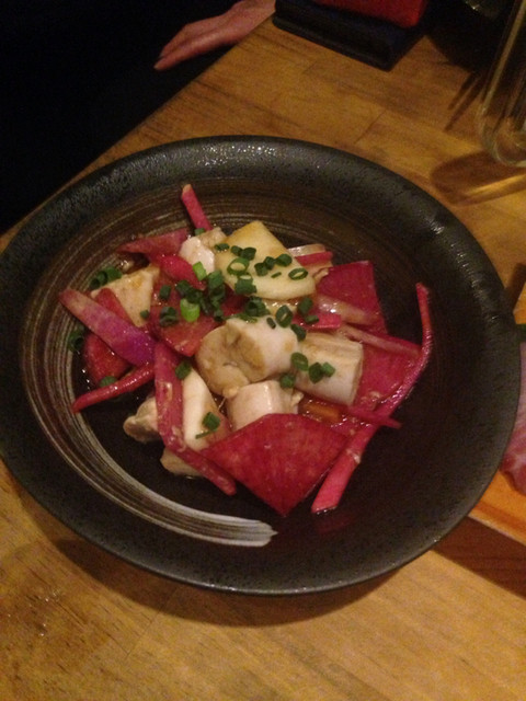 酢もつ、サラダ、マグロ白子など至る所で赤カブカットインしてきます