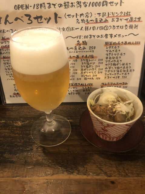 1杯目のビールと塩もつ煮(どちらもせんべろ内)
