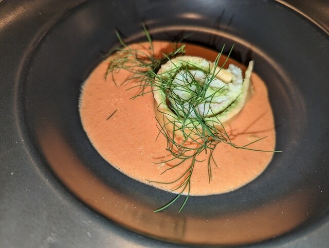 厚めのラザニアでヒラメを巻き、クリームトマトソースと絡んで美味しい