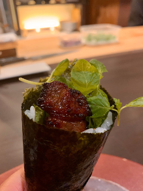 串で焼いたハラミを手巻きに巻いて、串を外せばできあがり!