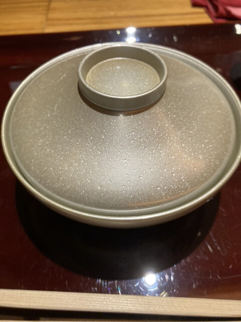 続いて、小鍋が用意される。無花果に穴子、茄子を胡麻餡でまとめ、実山椒をかけたもの。見た感じはホワイトグラタンのように見える。スプーンで口に入れると、無花果や茄子の甘さ、穴子の旨味に、胡麻餡がクリームソースのような舌触りで、すべての部材を上手く纏め上げ、和食に仕上げてある。実山椒の風味がよく、とても美味しくいただけた。