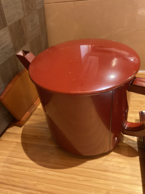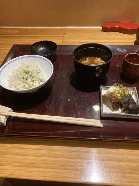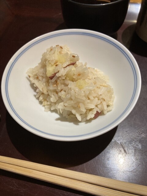 これまたこちらの店の名物である釜飯が用意される。この日は、秋刀魚ご飯。小梅の刻んだものと紫蘇が混ぜ込まれている。これに、海苔赤出し味噌汁と香の物が出される。香の物は、いぶりがっこ、山芋、山椒椎茸昆布。最後の日本酒をいぶりがっこで飲み干し、お茶碗によそってもらい釜飯を頂く。秋刀魚の旨味と出汁の旨味が染み、そこに小梅の風味が広がり、本当に旨い。また、赤出しにもよく合う。香の物も美味しい。ただ、この時点で満腹だったので、残りはおにぎりにしてもらった。