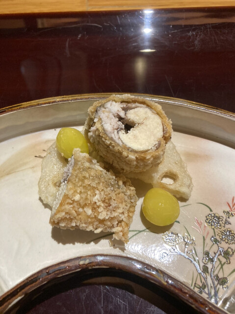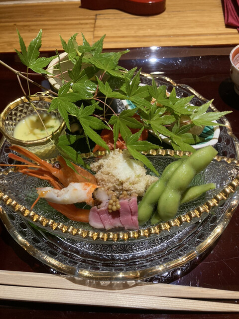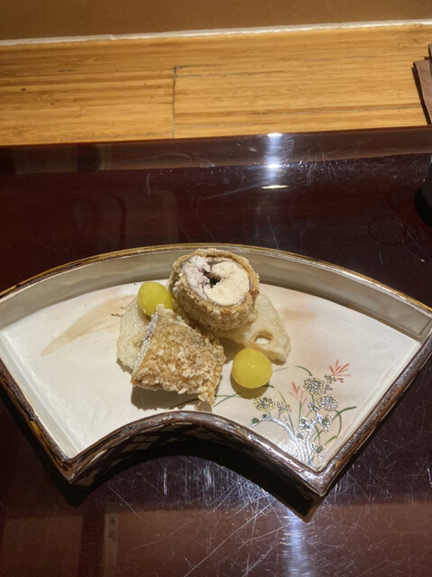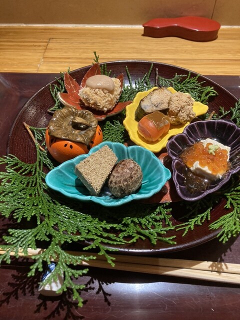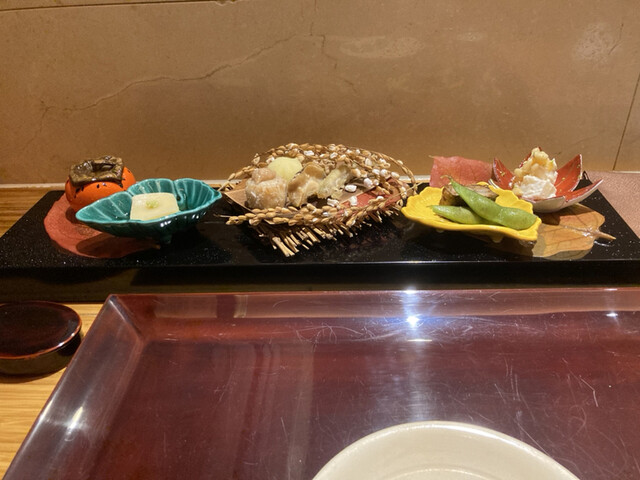 続いて八寸が長い皿で供される。料理は、紅葉の形の器には梨と柿の白和え松の実添え、菊花の器には枝豆と子持ち鮎甘露煮、簾の上に乗せた焼き杉板には、公魚天ぷら、つぶ貝やわらか煮、小芋胡桃味噌すりかけ、鱈子煮付け、薩摩芋きんとんに稲穂揚げ、青葉の器には、銀杏豆腐、柿の器にはあん肝が、それぞれ盛り付けられている。まるで心斎橋の桝田のように華やかな趣きを称え、かつ秋という季節を十分に表現している八寸である。