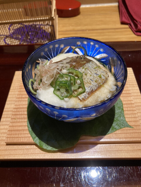 椀物は、鮎一夜干しに冬瓜、蓮根、潤菜。鮎がこんなに椀種に合うなんて知らなかった。出汁に鮎の旨味が溶け出し、鮎の身はもちろん、冬瓜や潤菜もとても美味しく頂けた。この椀物には驚かれた。もちろんうれしい意味である。椀が旨いと顔がほころぶ。
