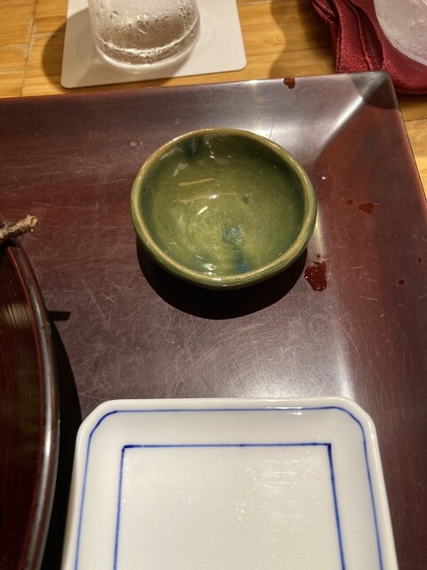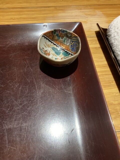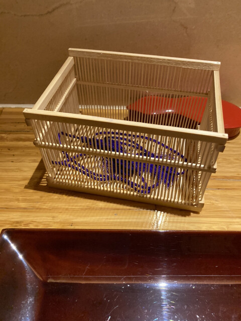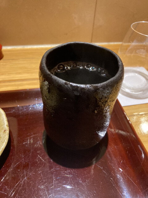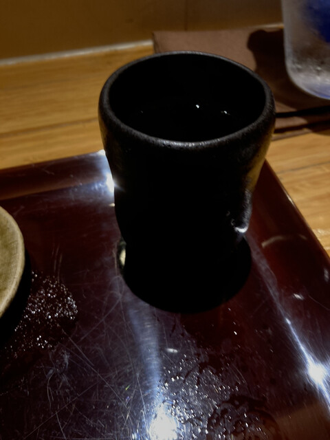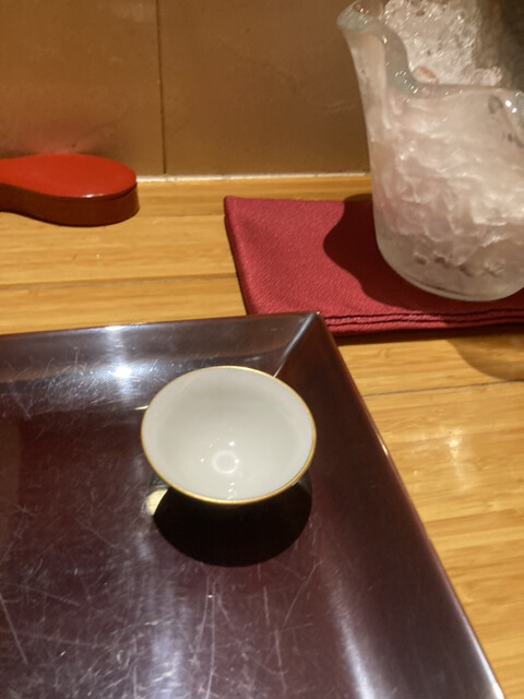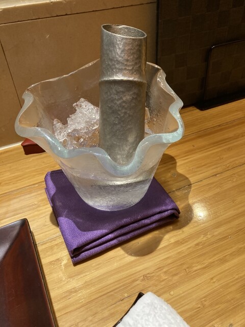 まずはメニューの中から東洋美人純米吟醸を注文する。すぐに杯を選ばせて下さる。次いで、ガラスの器に砕いた氷を入れ、錫製の竹筒型の酒器に東洋美人純米吟醸を注いで氷の中に酒器を入れたものが供される。