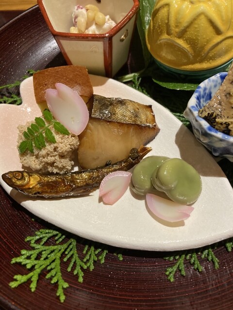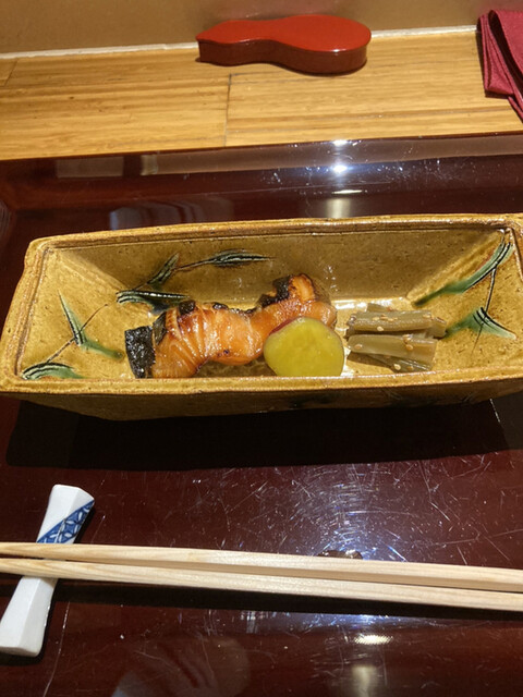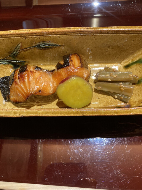 続いて焼き物が供される。琵琶鱒幽庵焼きに薩摩芋レモン煮と山くらげ有馬煮が添えられている。焼き上がった琵琶鱒からはとても良い香りが漂う。頂くと品よい薄めの味付けなのに、旨味の塊。自己主張が強い。日本酒にも合うし、ご飯が欲しくなる。また、山くらげも歯ごたえが楽しいし、薩摩芋レモン煮は、薩摩芋の甘さを一ランク高めている。