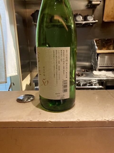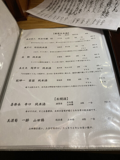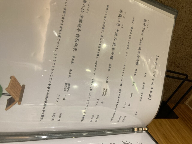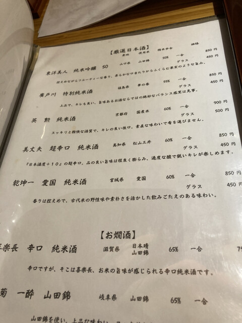 この日はすでに地元の先客が二組。楽しそうに食事されている。自分もカウンターに案内される。まずはメニューをみる。アラカルトの料理はどれも美味しそう。ただコースを頼んでいるので、物足りたければ食べてみようと思い、とりあえずドリンクメニューの中から東洋美人純米吟醸を注文する。