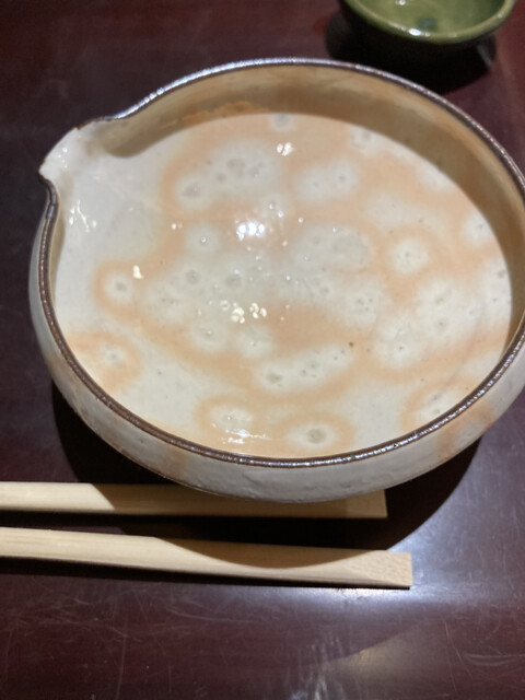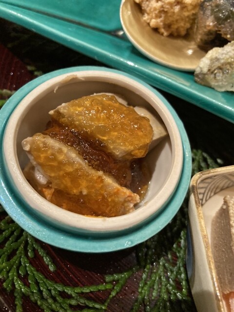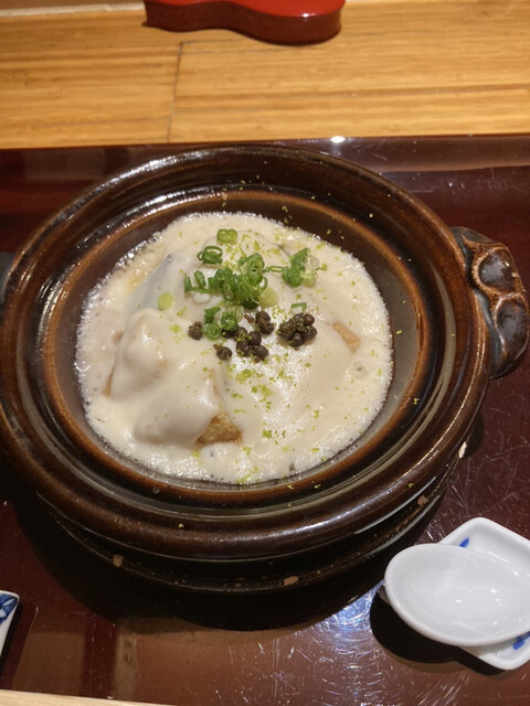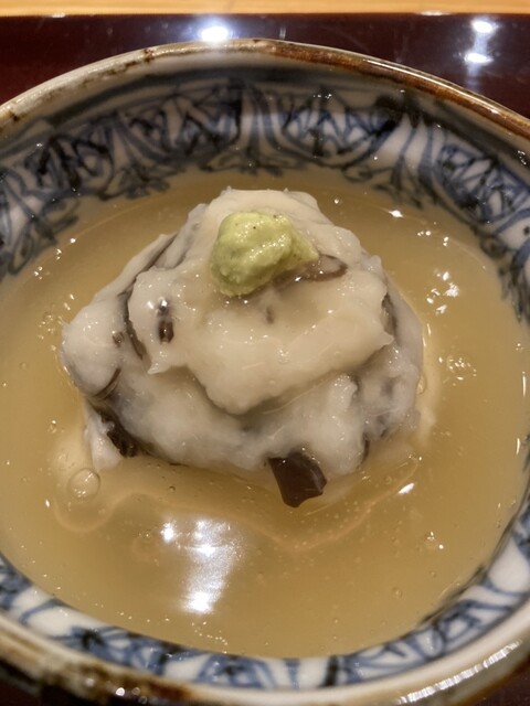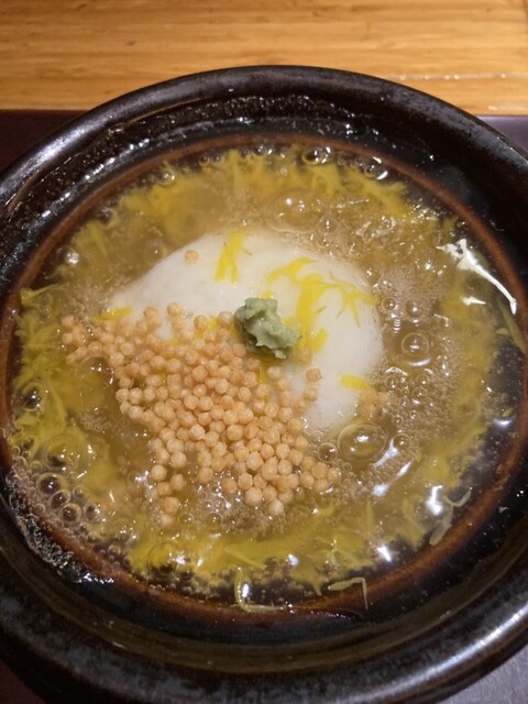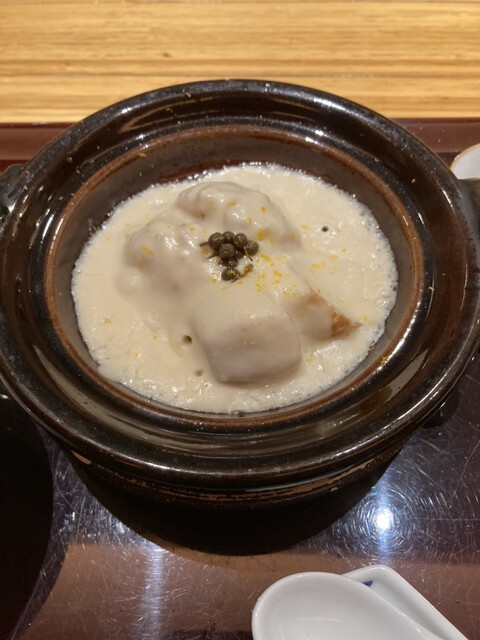 こちらのお店のスペシャリテである小鍋は、海老芋と雲子の霰揚げ胡麻餡掛け。見た感じは、和風クリームグラタン。しかし、餡とともに海老芋を頂くとまごうことなく和の味わい。霰の香ばしさにねっとりとした海老芋の美味さが広がる。更に雲子は香ばしさとまったりとした味わいが混然一体となり、とても旨い。火傷しそうになりながら、餡まで残さず綺麗に頂いた。
