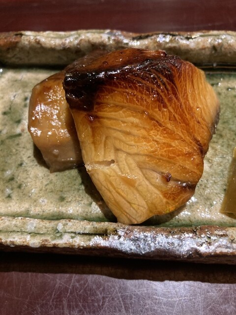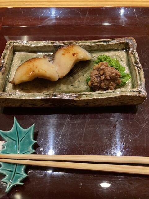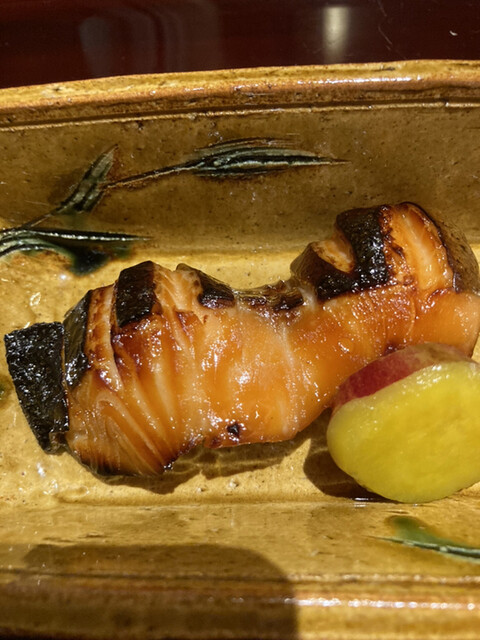 八寸に続く焼き物は、鰤味噌幽庵焼、山海月(海月)が添えられている。脂の乗った鰤だと普通の幽庵だと負けてしまいそうに感じるが、味噌幽庵だと、鰤の旨味と味噌の香り、幽庵の爽やかさがうまく調和し、美味しく頂くことができる。これまた秀逸な一品。山海月の歯ごたえも楽しく、酒が進む。