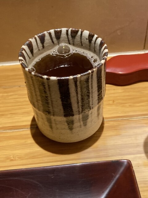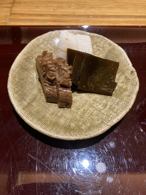 向付は、北海道の鰤腹身、鮃の身と縁側、鰹藁叩き。醤油とポン酢が用意される。鮃は真冬のものとは違い軽やかな脂で、縁側の食感もよい。鰤腹身は、きめ細やかな脂が乗っていて、醤油を付けると、醤油の表面に脂が軽く広がる。鰹は藁で表面を炙ったもの。香ばしさと戻り鰹らしい脂の乗りがいい。どれも美味しく頂けた。日本酒も進む。