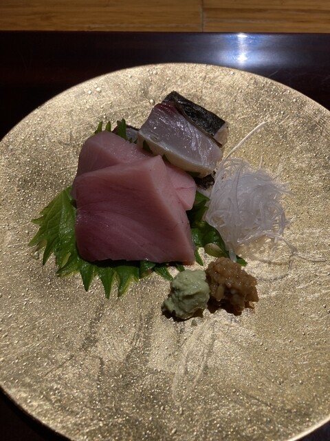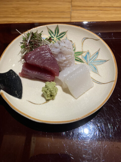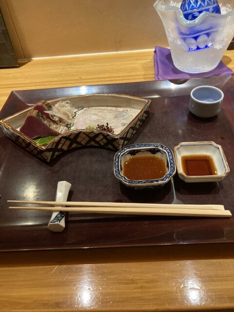 続いて、向付が供される。鱧焼き霜、鰹、槍烏賊。鱧の焼き霜は程よい温度と炙り加減で美味しく頂けた。また、槍烏賊も旨味がたっぷり。