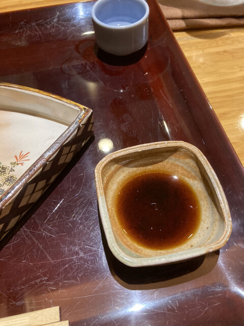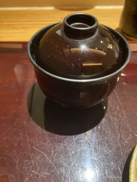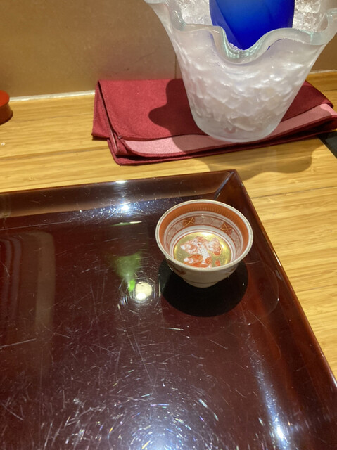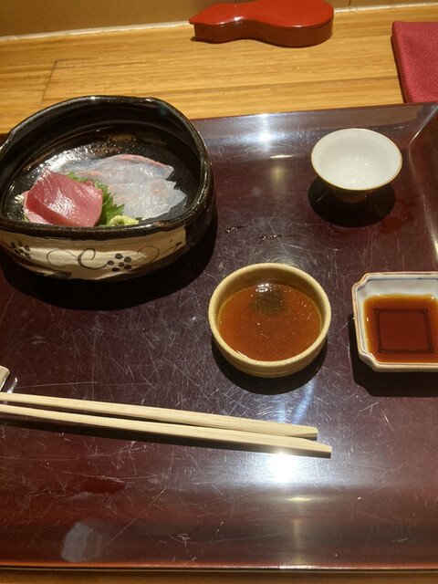 向付は、鮃とヨコワ、ポン酢と醤油が用意される。鮃はポン酢で頂く。淡い飴色の鮃は脂が乗り、とても旨い。ヨコワは、中トロから霜降りの部分になるが、程よい脂の乗り加減で、これまたとても旨い。和食の向付として非常に品よく仕上がっていると感じた。