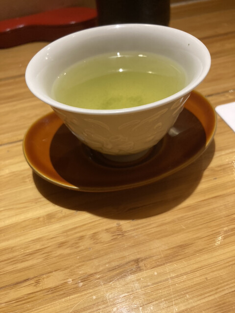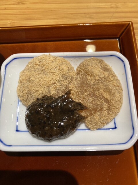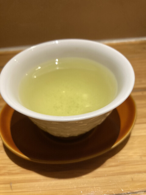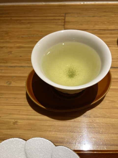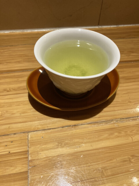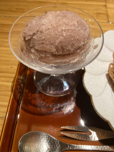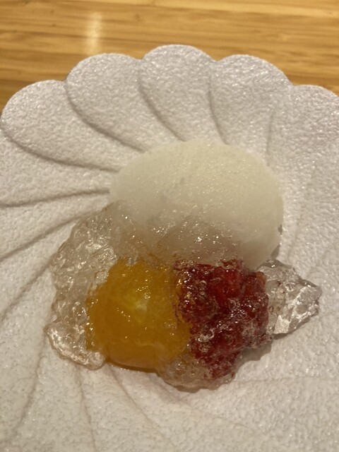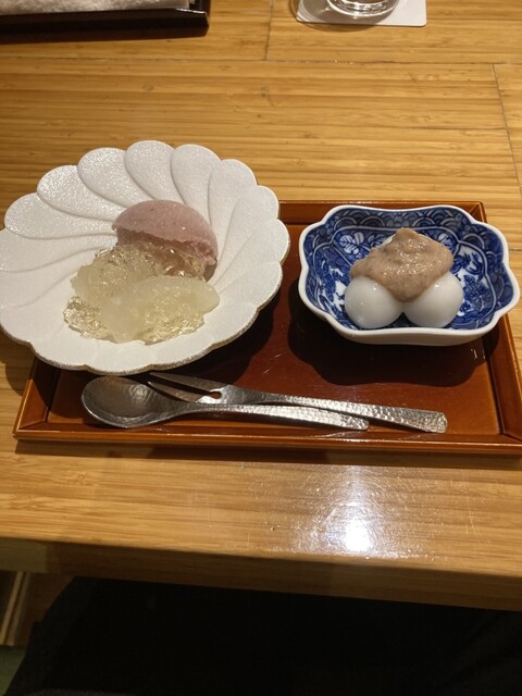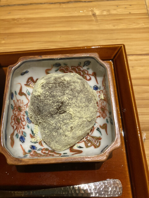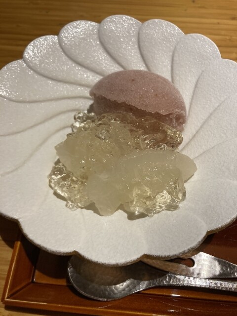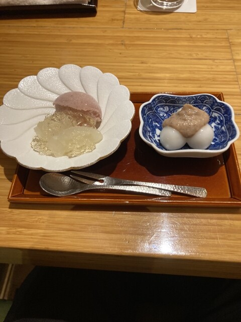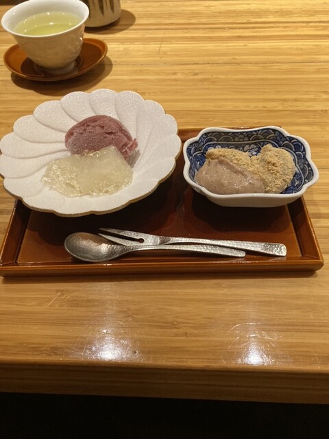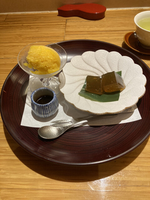 最後の水菓子はマンゴーとシャンパンのシャーベットに、蓮根餅、そしてすごく香りの良い煎茶が用意された。マンゴーシャーベットは爽やかで、体中がさっぱりとした感じになる。また蓮根餅は、黒蜜のようなものをつけていただく。最後にしっかりと甘いものを食べると、これまで食べた料理がくっきり生きてくる。 最後まで満足したお料理であった。
