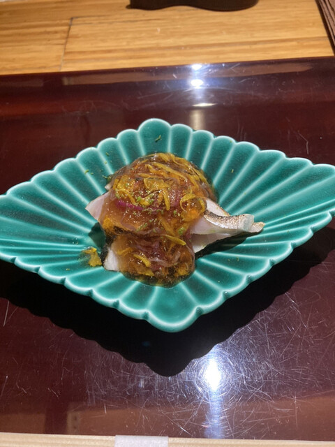 すぐに先付が運ばれてくる。秋鯖の〆鯖を加茂茄子の上に乗せ、菊花を散らしたポン酢ジュレを開けたものである。鯖の締め加減はちょうど良く、 ジュレも爽やかだけど酸味が柔らかでちょうど良い。茄子も爽やかでおいしい。この季節の鯖は本当に旨いと思う。