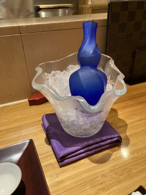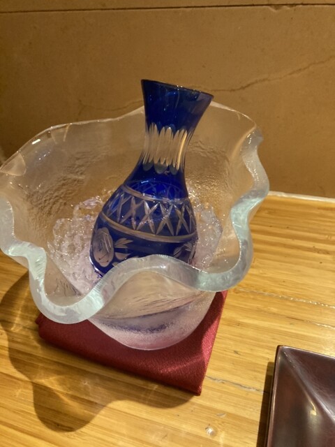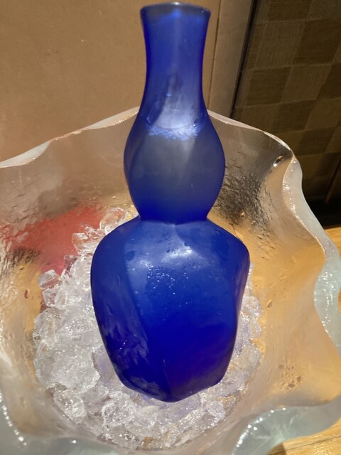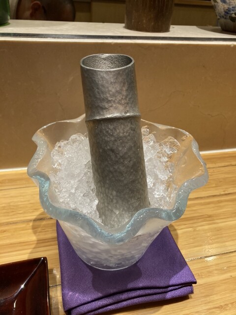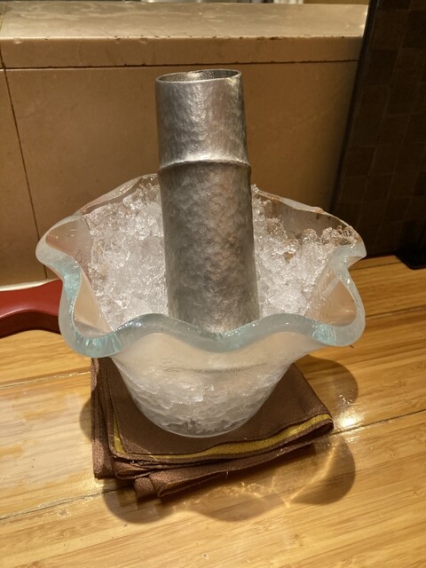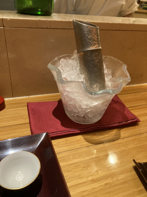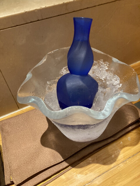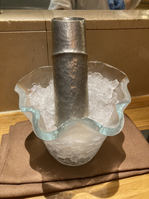 すぐに大きなガラスの器に氷をいっぱい入れ、その中に錫製の竹のような器に日本酒が入れられて供される。できる限り小さな杯を選んで、まずは一献。冷えた香り高い東洋美人はとても旨い。