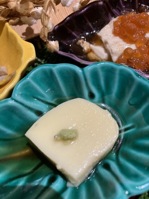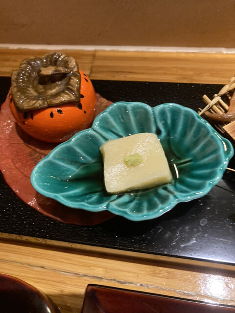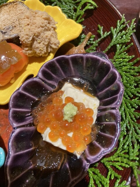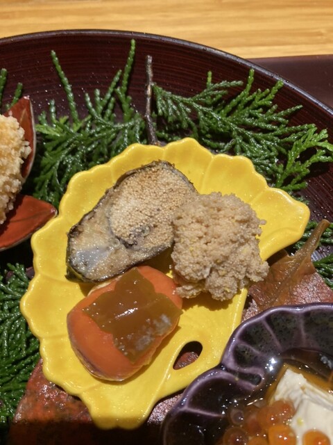 続いて、大皿で八寸が華やかに供される。料理は、小芋衣被大徳寺納豆鋳込み、鶏肝松風、柿なます、無花果霰揚げ、子持ち鮎甘露煮、鱈の子の含め煮、柚子を効かせた出汁で炊いたもの。鮭黄身寿司、湯葉といくらの山葵乗せ。どれも旨いし、酒によく合う。特に、衣被大徳寺納豆鋳込みは、小芋のねっとりした旨味に、大徳寺納豆のほろ苦塩っぱさが絶妙のアクセントになり、感動する一品。また、柿なますや子持ち鮎甘露煮は、季節感溢れ、八寸全体がすごく楽しく感じた。日本酒を飲み切り、続いて廣戸川特別純米を注文する。これまた、すっきりした飲み口で、食中酒にいい。